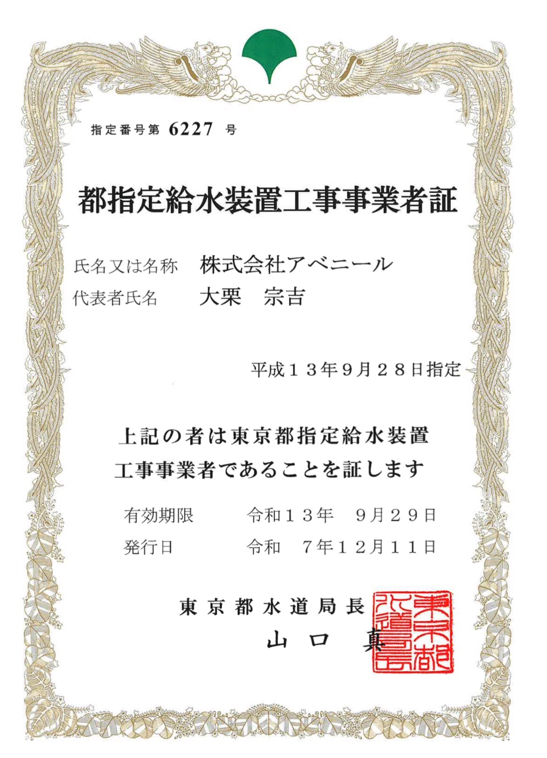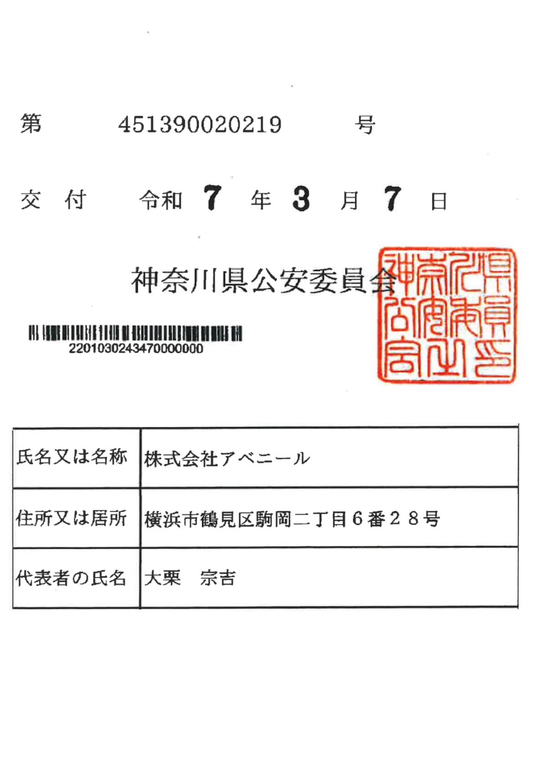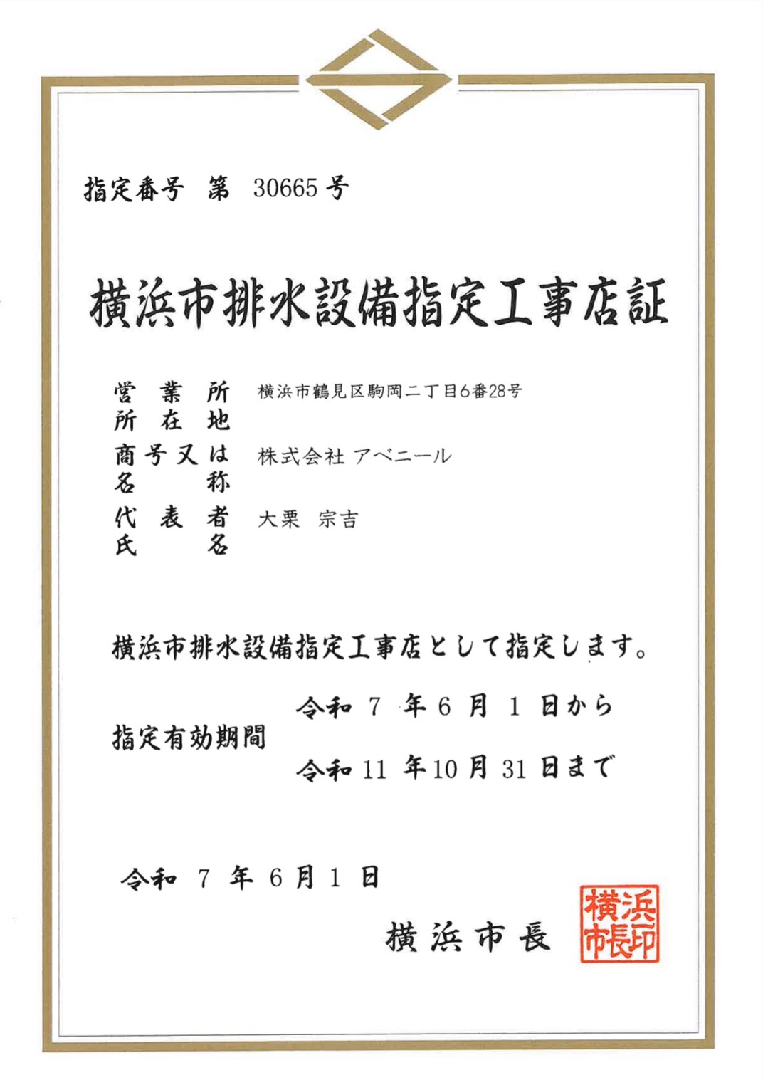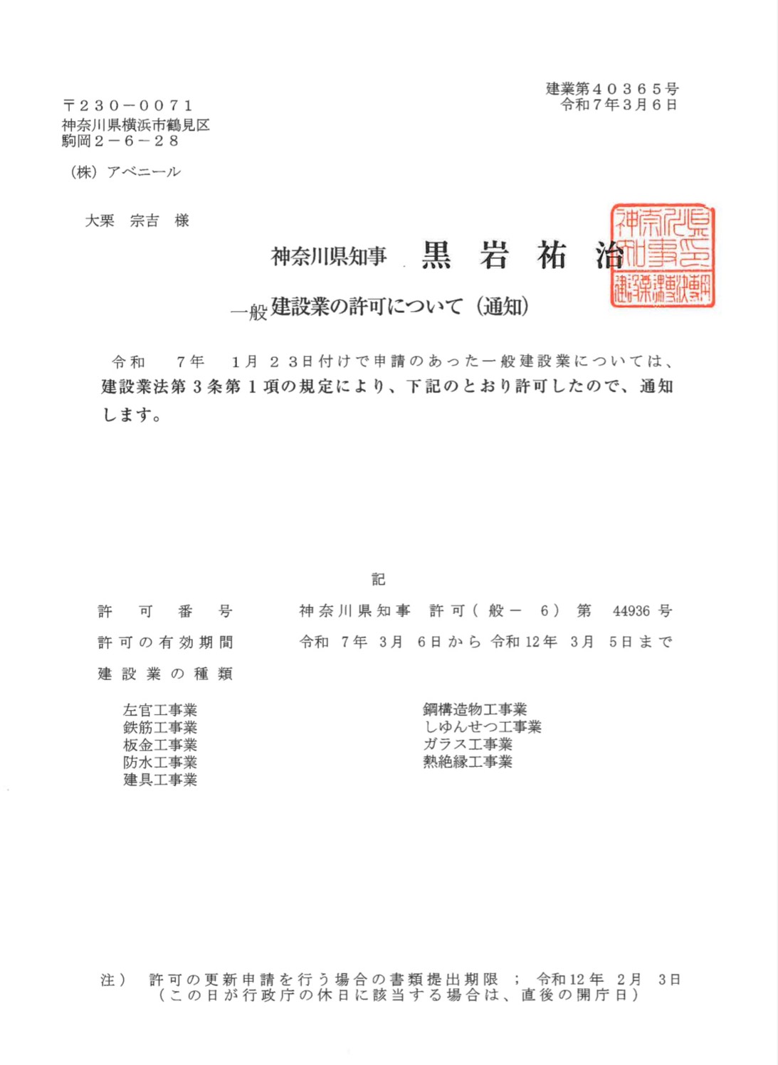 | 商号 | 株式会社 アベニール | | 住所 | 〒230-0071 神奈川県横浜市鶴見区駒岡2-6-28 | | TEL | 045-575-5848 | | FAX | 045-575-9350 | | Email | info@k-avenir.com | | 設立 | 昭和61年7月8日 | | 代表取締役 | 大栗 宗吉 | | 営業内容 | - 建築工事・土木工事の請負